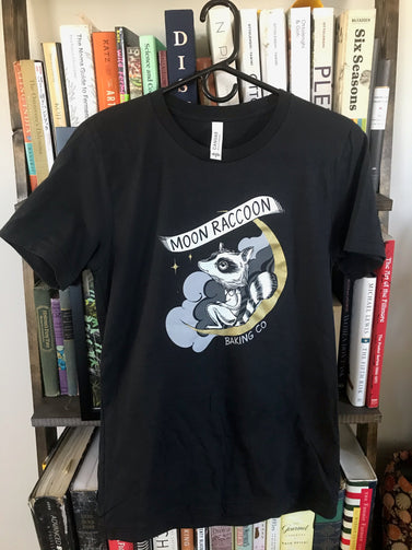 Black unisex t-shirt from BELLA+CANVAS with Moon Raccoon Baking Co. logo on the front. XS-3XL available. Printed by our friends at CreationLab Shop in Windham, ME using sustainable practices and water-based ink for a super soft, vintage feel.