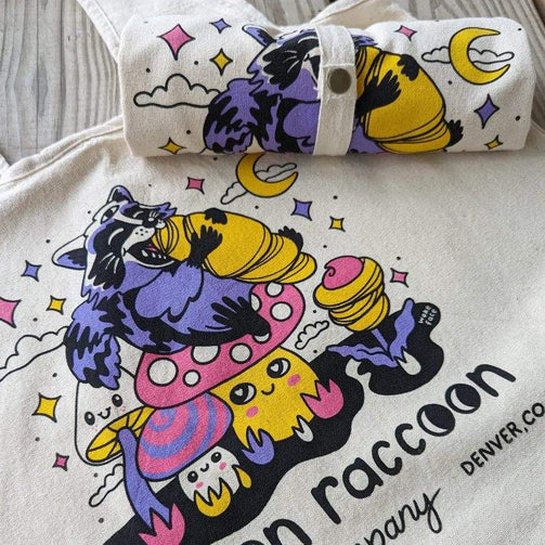 Foldable, 100% cotton tote bag with an adorable raccoon pastry party design by Wokeface. Roomy but also compact for storage! Perfect for keeping in your bag for groceries, farmers market runs + more.